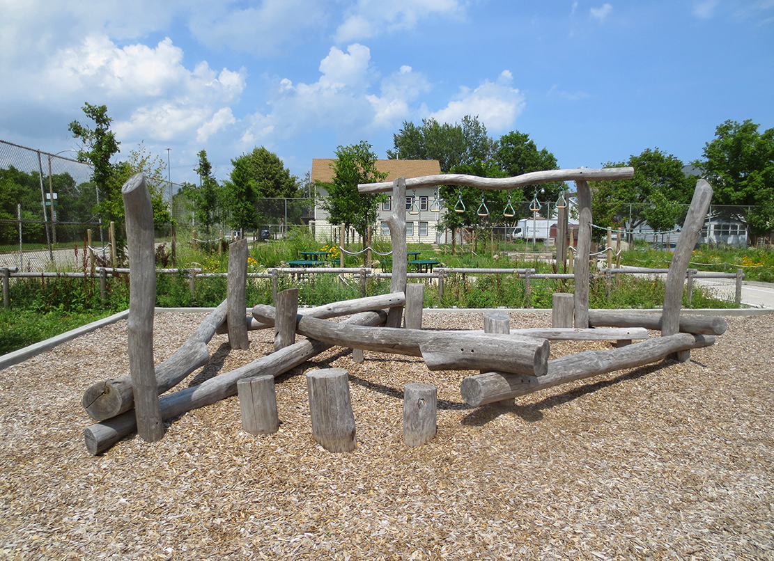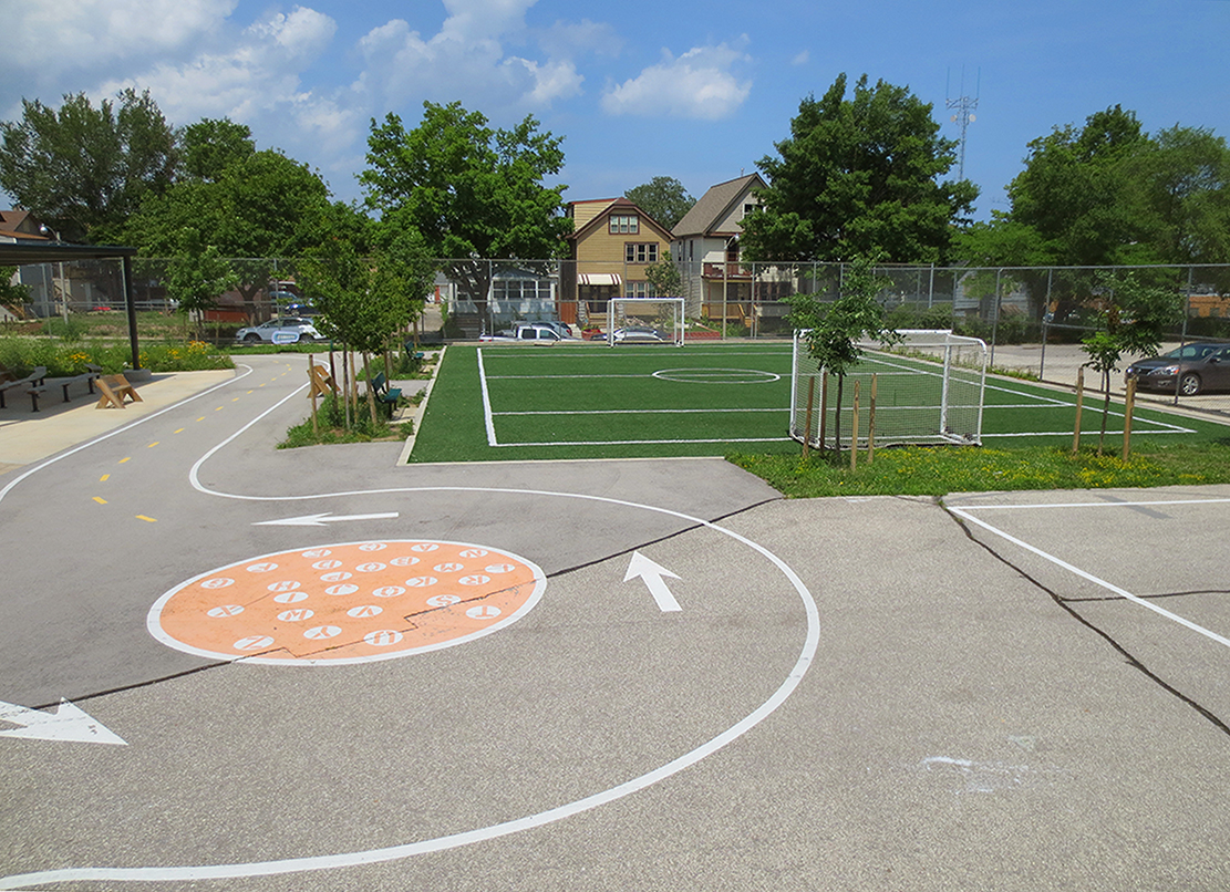 This project transformed the Riley Dual Language Montessori schoolyard from a vast, plain asphalt surface into a vibrant, multi-functional playscape that champions sustainability and experiential learning. The core goal was to replace impermeable pavement with features that actively manage stormwater including infiltration basins, a large underground cistern beneath a new athletic field, and strategically placed “stormwater trees” that provide shade while improving water quality. Layered on top of these green infrastructures improvements were the incorporation of new play areas and learning zones with opportunities to engage in nature- based play.